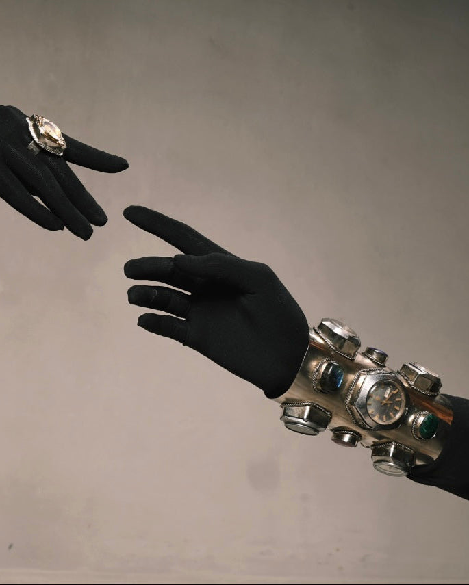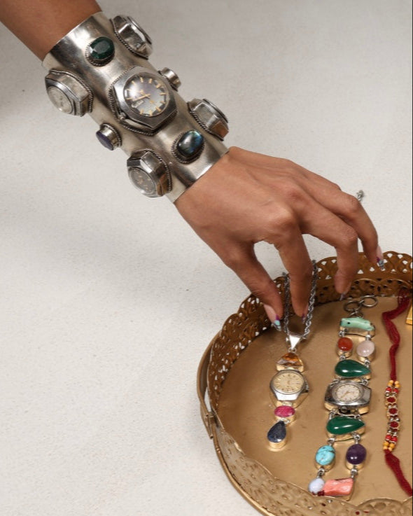 This cuff is embellished with vintage watch dials. 5-6 watch dials + gem stones in this product. These are one of a kind pieces. So every piece will have a slightly different version of similar vintage dials and gem stones. However the structure and size remains the same. A very versatile piece of wearable art suitable for both Indian and Western attires. Can be donned at cocktail parties, dinners, festivals, events etc. Also makes for a great gift.