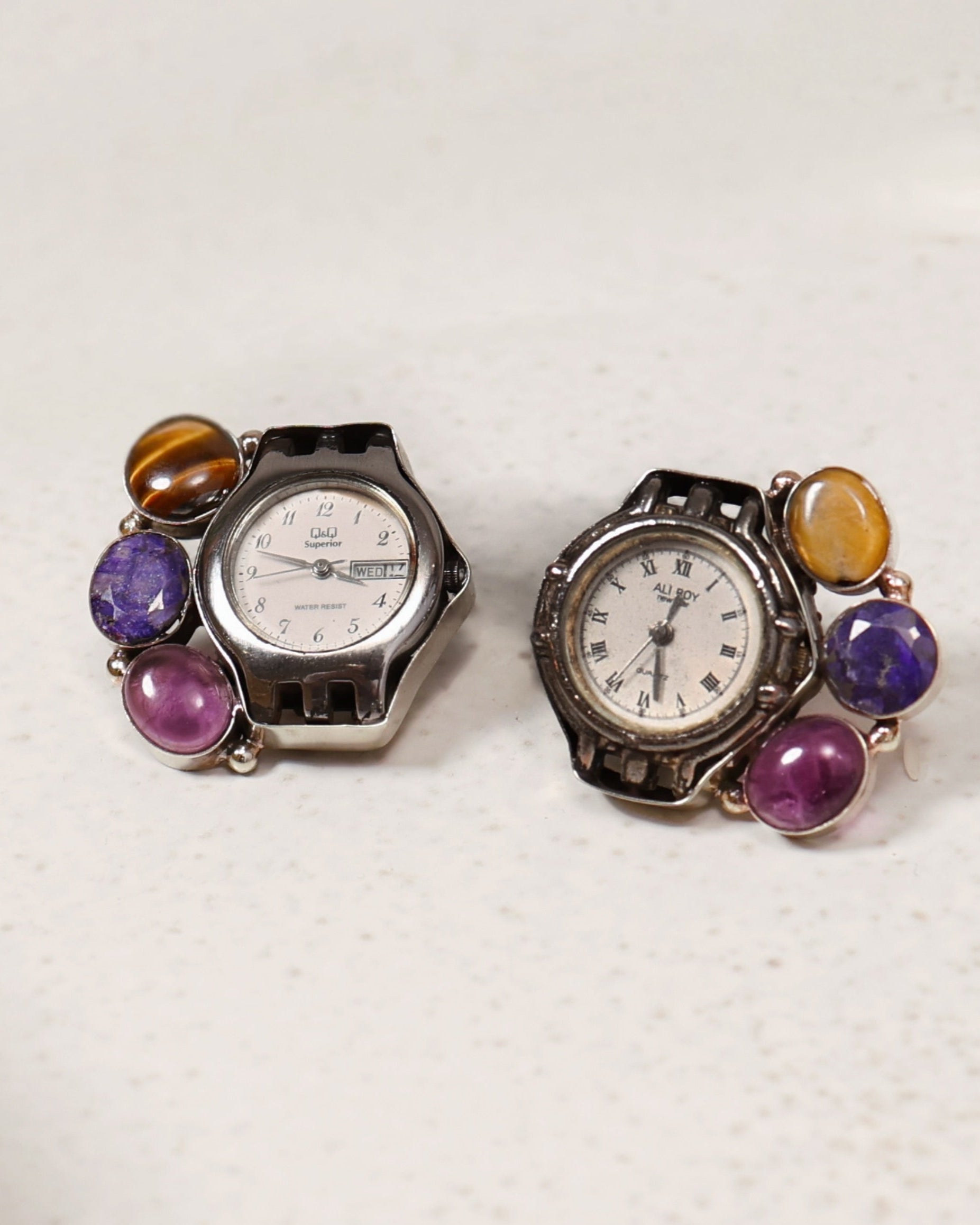 These earrings are made with two vintage watch dials. 2 watch dials + gem stones in this product. These are one of a kind pieces. So every piece will have a slightly different version of similar vintage dial and gem stones. However the structure and size remains the same. A very versatile piece of wearable art suitable for both Indian and Western attires. Can be donned at cocktail parties, dinners, festivals, events etc. Also makes for a great gift.